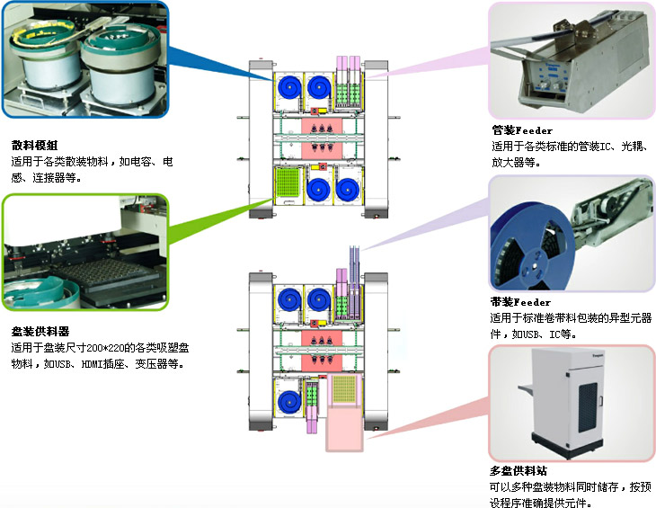 | 可配置各式供料站 | 散裝、帶裝、管裝、盤裝、多盤供料站(*z) |